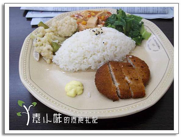這是素食豬排飯,素豬排炸的外酥內嫩,配上他的醬料 很好吃。